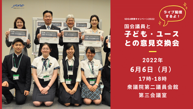 「SDG4教育キャンペーン」(教育協力NGOネットワーク(JNNE)主催、認定NPO法人開発教育協会(東京都文京区)事務局)は、「SDG4教育キャンペーン2022」の一環として、子ども・ユース世代の代表と共に国会議員と意見交換会を開催します。子ども・ユース世代による政策提言を受けた、各党議員からの発言も注目されます。