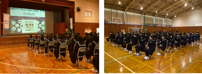 当日は体育館に1年生全71名が集まり、地域学授業の主題である「地域の人や仕事との関わりによる社会体験」に沿い、かもめ島マリンピング運営事務局とスタッフおよび観光業全般の内容についての紹介を実施。体験プログラム構築のアイデアの土台となる「江差町とかもめ島の魅力」「海の魅力」「江差町で提供中の体験プログラム」「体験プログラムを考えるうえで必要なこと」などについて、スライド上映しながら生徒たちに説明を行いました。生まれて初めて経験することになる本格的な社会参加の取り組みを前に、生徒たちはワクワクしながら目を輝かせ、熱心に聞き入ってくれている様子でした。