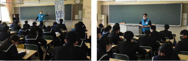 続いて2クラスの教室に分かれ、生徒の今後の歩みの参考にしてもらうため、2名の講師がそれぞれの経歴や人生経験を生徒たちに楽しく話して聞かせました。空気が和らぎ、発言も出るようになったところで、実際に体験プログラムを設計する場合と同じ考え方の手順が示されたワークシートをもとに、それぞれ考え記入を始めてもらいました。どちらのクラスでも、記入に躓くたび積極的に質問をしてくれ、熱心に「海の学びが得られる体験プログラム」について議論を交わしました。また、同年代の体験者のことや地域のことも考え熱心にペンを進めてくれ、非常に活発な授業となりました。