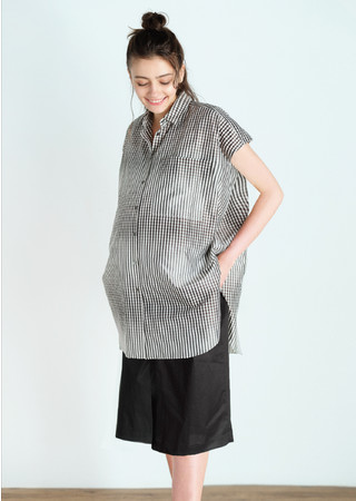これからの汗ばむ季節に、さらっと軽く着られて便利なアイテムをつくりたいと考えました。イージーケアの、ゆったりとしたオーバーサイズシルエットのシャツをつくりました。