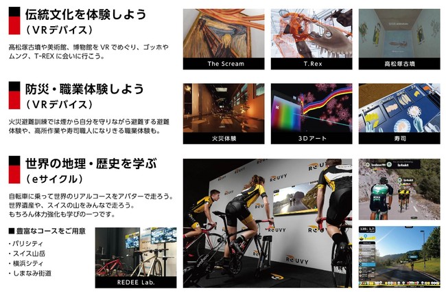 主な体験メニューは「VR防災・避難体験」「VR伝統文化歴史鑑賞」「VR匠の技を体験」「VR職業体験」「VR3Dアート体験」「VR世界アート鑑賞」「eサイクル地理歴史探訪」「eサイクル体力強化」。伝統文化や防災・職業体験をしたり、世界の地理や歴史を学んだりできます。REDEEでのこれらの体験を通じて、子どもたちが多くの刺激を受け、感性を磨き、創造力をはぐくむことによって、子どもたちの未来の可能性をひろげるお手伝いができればと考えます。