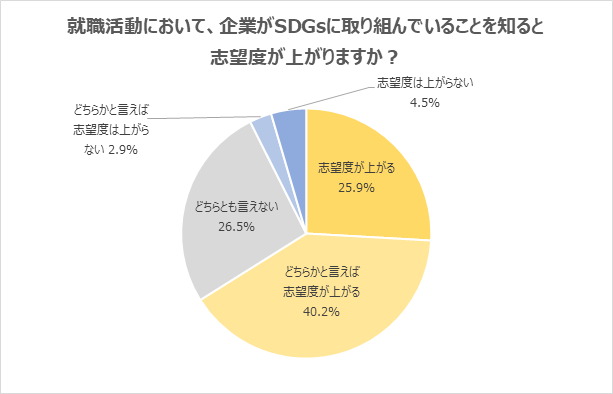 就職活動において、企業がSDGsに取り組んでいることを知ると「志望度が上がる」と回答した学生が25.9%に上りました。「どちらかと言えば志望度が上がる」の回答(40.2%)を合わせると、7割弱の学生が「企業がSDGsに取り組んでいることを知ると、志望度が上がる」としています。「社会貢献性が高く、やりがいを持って仕事ができそう」「SDGsの達成に向けて取り組むことは、企業として当たり前だと思う」「現在だけでなく、将来のことを考えている企業だと思う」「ESG投資が増えているので、SDGsに取り組む企業のほうが成長力が高そう」といった声が上がっています。また、「実際にどのような取り組みをしているのか注目している」「ブームに乗っているだけの企業もあるように感じているので、実際にどのように貢献しているのかを知りたい」などの指摘も寄せられました。SDGsに取り組んでいるかどうかだけでなく、取り組みの内容も含めて注目していることが分かります。