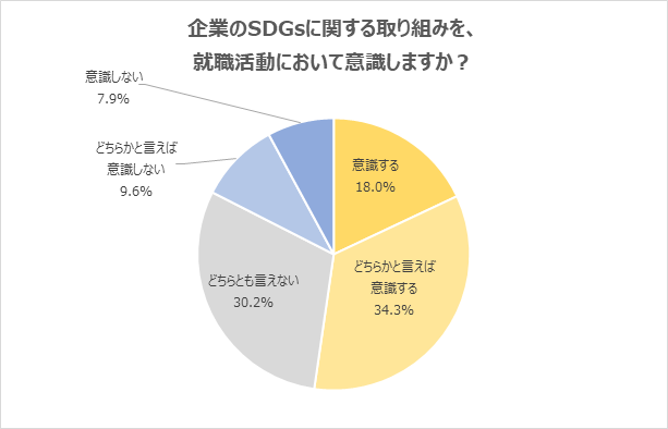 「SDGs」に関する取り組みを、就職活動において「意識する」「どちらかと言えば意識する」と回答した学生が52.3%に達しました。半数以上の学生が、就職活動においてSDGsを意識していることが分かります。「仕事を通して、社会に貢献したい」「社会貢献性の高い事業をしている企業で働きたい」などの声が上がっており、就職活動において、「社会貢献性」を意識していることが伺えます。