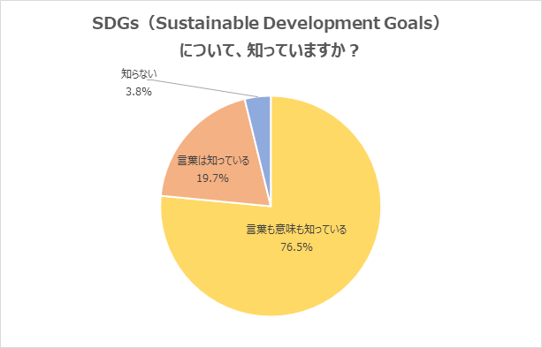 「SDGs(Sustainable Development Goals)」について、「言葉も意味も知っている」の回答が76.5%でした。「言葉は知っている」の回答(19.7%)も合わせると、96.2%が「SDGs」について「知っている」ことが分かります。