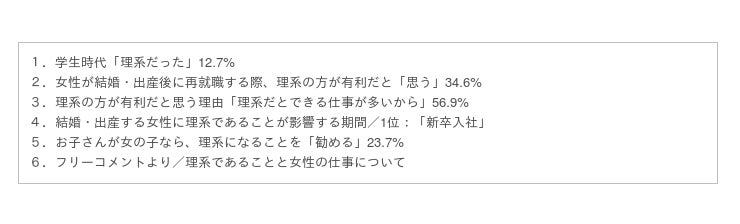 ・出産で研究等のキャリアを断念することになるのでは、というイメージが強い。一度辞めると理系のキャリアが活かしにくい気がします(40代:パート/アルバイト:理系ではなかった)