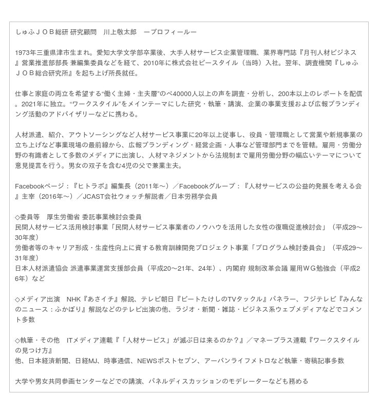 ■しゅふJOB総研 研究顧問 川上敬太郎より