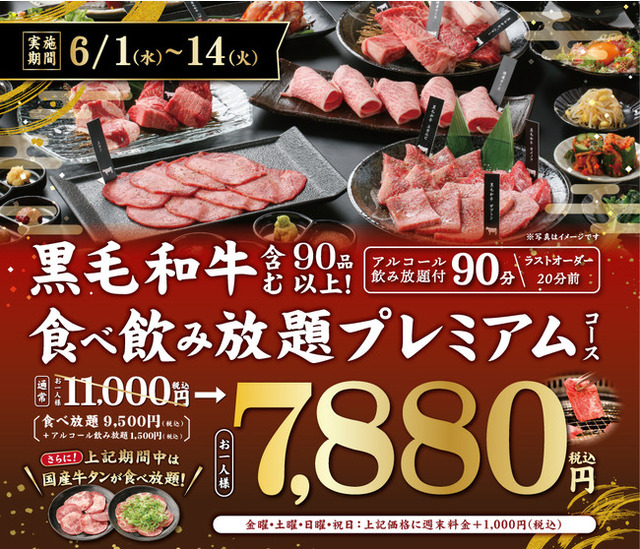 セール名称:黒毛和牛を含む90品以上が食べ放題になる「焼肉食べ飲み放題プレミアムコース」の予約限定割引。期間中に限り“国産牛タン”も食べ放題。