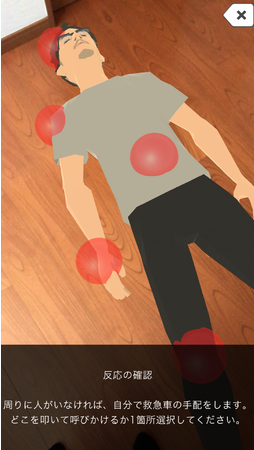 AR技術を使用しているため非対面で訓練をすることができます。任意の場所に心停止傷病者のアバターを出現させ一次救命処置における胸骨圧迫やAED操作まで一連の動作を学習する事ができます。問題形式となっているため訓練や教育アプリとしてご使用していただくことも可能です。「死戦期呼吸」という心停止直後にみられる異常な呼吸運動についても3DCGで再現しており、一般的な心肺蘇生訓練用マネキンでは不可能な部分を学習することができます。