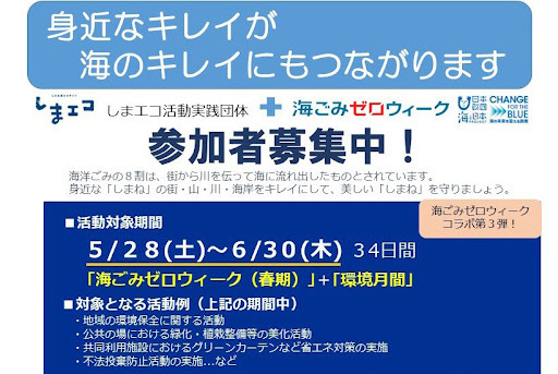 島根県環境政策課では活動への参加を推進しようと、5月28日(土)に始まる「春の海ごみゼロウィーク」と、6月の環境月間を、「しまエコ活動」の活動期間として事前エントリーや活動の報告を募集しています。