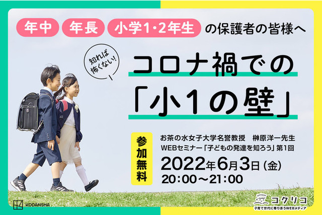 株式会社講談社の子育て情報メディア「コクリコ」は、2022年6月3日(金)にオンラインライブセミナーを開催します。子どもの発達研究の第一人者である、お茶の水女子大学名誉教授・榊原洋一先生を講師に招き、「小1の壁」に悩むパパママの心配や疑問に応えます。