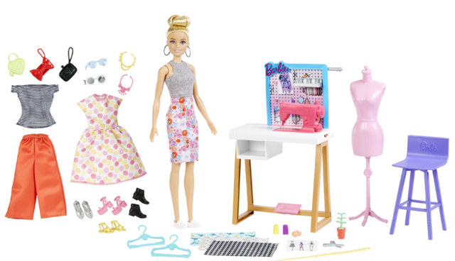 シックな服装のドールと一緒に、デザイナーごっこを楽しめるセットです。デザインスタジオには、ファッションを作るためのアイテムである、生地見本やミシン、巻き尺など25種類以上の楽しいアイテムが含まれています。バービーはデスクに座ってデザインをスケッチし、巻き尺とソーイングアイテムを使って、3つの生地見本の中から好きなものを選びカットすることができます。その後、作業台で生地を縫ったり、マネキンに着せてできあがりを確認したりでき、デザイン遊びとファッション遊びの両方が楽しめます。
