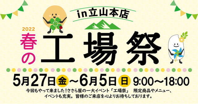 創業98年の老舗米菓メーカー日の出屋製菓産業株式会社(本社:富山県南砺市、代表取締役会長:川合 声一)が運営する直営店「ささら屋」の旗艦店の一つである「ささら屋立山本店」は、5月27日(金)~6月5日(日)に半年に一度の大型イベント「春の工場祭in立山本店2022」を開催します。
