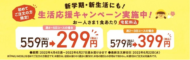 これから「PAKU MOGU」を始める方は、週4~5日コースのご注文でお1人さま1食あたり299円よりご注文できる「生活応援キャンペーン」をご利用いただけます。ぜひこの機会にお試しください。