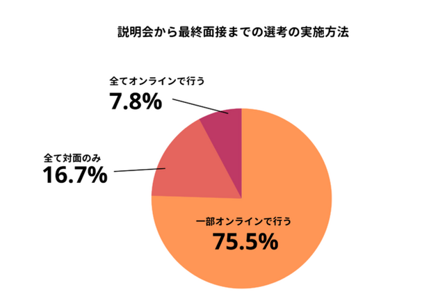 説明会から最終面接までの選考の実施方法について尋ねたところ、75.5%が「一部オンラインで行う」と回答し、「全てオンラインで行う」(7.8%)を合算すると、83.3%がオンラインでの選考を導入しているという結果になりました。