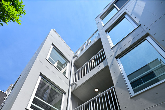 本物件はワンボリュームの箱型ではなく階段室型を採用することで建物を分節し、さらに配置を互い違いにずらすことによって、すべての住戸が2面もしくは3面開放が可能なプランを実現。大きな窓やバルコニーによって光があふれ風が吹き抜ける住空間を生み出し、各住戸に面積以上の広がりと開放感を与えています。また、共用部や階段室にも住戸間の隙間から空への“抜け”をつくることにより、移動と共に景色が切り替わる路地を歩くような、新鮮な体験を生み出しています。