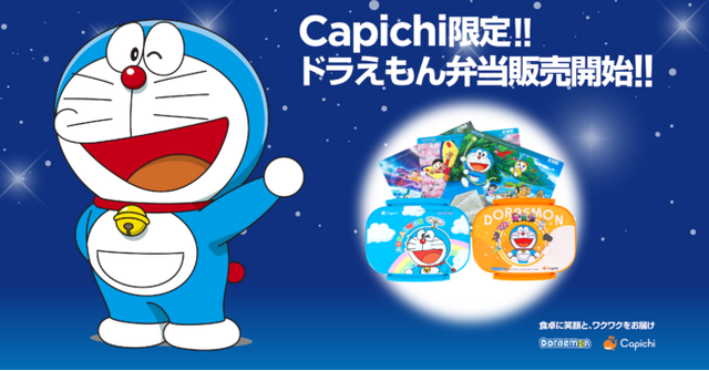 ドラえもん寿司弁当は、限定デザインのドラえもん弁当箱を使ったお子様向けの寿司弁当に本キャンペーン限定のドラえもんパズルをセットにした特別なお弁当です。これを5月27日から6月末までCapichiサービス上の一部対象店舗のみで期間限定販売します。(お弁当が売り切れ次第で販売は終了になります。)