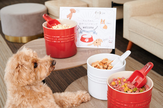 ドッグフレンドリーラウンジにて、ウェルカムトリートサービスをご提供いたします。色鮮やかなル・クルーゼのペットフードコンテナーで、ここでしか味わえないわんちゃんのおやつ三種類を揃えました。異なる風味や食感の違いを存分にお楽しみいただける、国産の原材料を使用したひと口サイズの安心安全なおやつをバイキングスタイルでご体験いただけます。また、わんちゃんと一緒に食べられるケーキをご用意し、愛犬のお誕生日や家族の記念日など特別な一日を華やかに演出いたします。