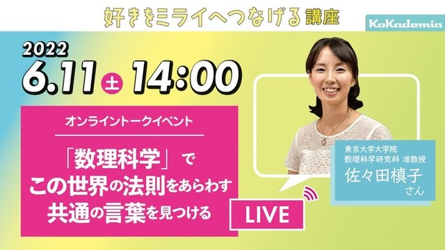 6月11日(土)には、東京大学大学院 数理科学研究科准教授の佐々田槙子さんがトークライブイベント「好きをミライへつなげる講座」に登場。数学者の仕事の現場や、研究の魅力、学生時代の経験、そして佐々田さんが力を入れる女性数学者のサポートについてお話していただきます。