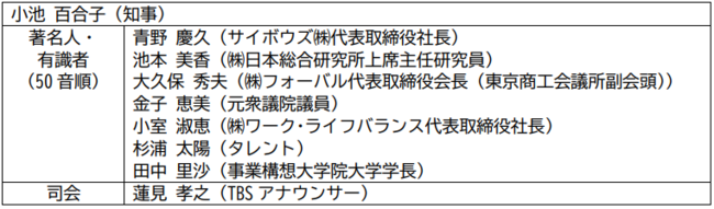 (敬称略、50音順)青野 慶久(サイボウズ株式会社代表取締役社長)/池本 美香(株式会社日本総合研究所上席主任研究員)/大久保 秀夫(株式会社フォーバル代表取締役会長(東京商工会議所副会頭))/金子 恵美(元衆議院議員)/小室 淑恵(株式会社ワーク・ライフバランス代表取締役社長)/杉浦 太陽(タレント)/田中 里沙(事業構想大学院大学学長)