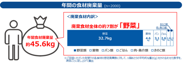 ・ 1人あたりの年間食材廃棄量:平均約45.6kg(回答者2,000人を合計すると、年間約9.1トンの食材廃棄量)