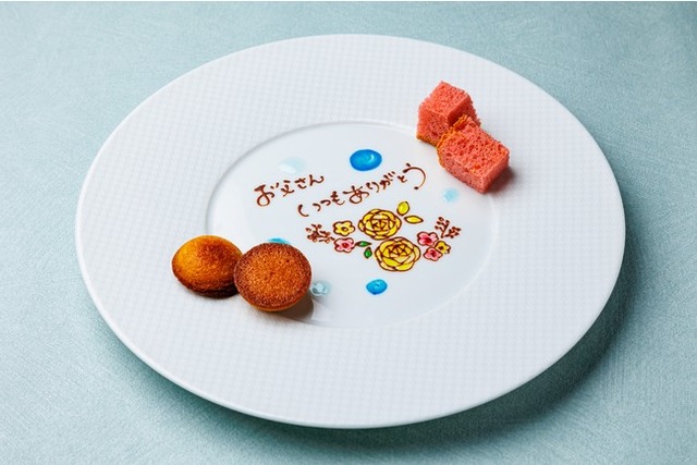 まずはお食事の前に乾杯グラスシャンパンで大切なお席を華やかに彩ります。フレンチコースのお食事を愉しんでいただいた後は、お父様へ感謝の気持ちをこめたメッセージプレートをお渡し。