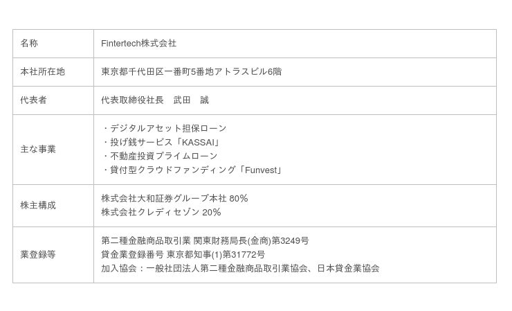 Fintertech は、大和証券グループ本社及びクレディセゾンがそれぞれ創業来培ってきた金融ビジネスのノウハウを礎としながら、最先端のテクノロジーの活用や外部企業との連携により次世代金融サービスを機動的にかつ柔軟に創出することを目指しています。暗号資産を担保とする「デジタルアセット担保ローン事業」、オンライン投げ銭SaaSの「KASSAI事業」、投資目的で不動産を購入する際の資金を融資する「不動産投資プライムローン」を展開しています。