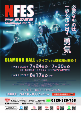今回、7月にNSMにて行われる予選を勝ち抜いた出場者は、8月17日(水)に名古屋最大級のライブハウス「DIAMOND HALL」にてパフォーマンスをする出場権を獲得します。