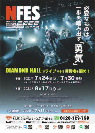 NFESとは、名古屋市栄にある名古屋スクールオブミュージック&ダンス専門学校が主催する、音楽活動を頑張る中学生・高校生を応援するためのライブイベントです。