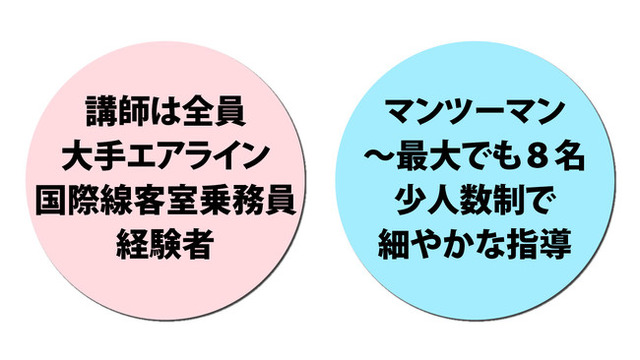 JTCIエアラインスクールの講師は全員が大手エアライン国際線旅客乗務員の経験者で、管理職クラスから若手まで、さまざまな講師が揃っています。客室乗務員訓練部教官経験者、採用面接経験者、時には現役のゲスト講師を招くなどし、面接のスキルや働く上での心構えなど、就職後にも役立つ知識を学んでいくことができます。マンツーマンから最大でも8名の、徹底した少人数制だからこそできるきめ細やかなアドバイスで、受講者のスキルをとことん伸ばしていきます。