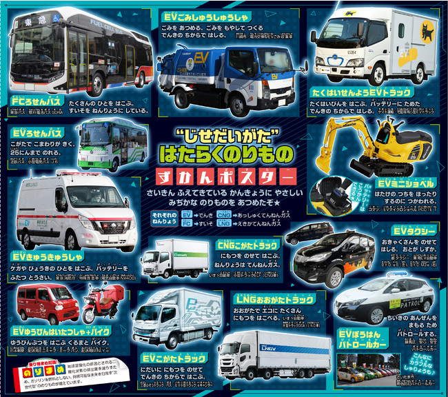超最新版! 電気や水素の力で走るのりものなど、最近街で見かけるようになった新しいはたらくのりものを集めた図鑑ポスター! 見たことのあるのりものはあるかな?