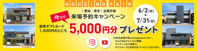 アールギャラリーホームページの来場予約フォームからご予約の上、当社の住宅展示場に初めてご来場され、アンケートにすべてご回答いただき、当社のInstagramのフォローとYouTubeのチャンネル登録にご協力いただいたお客様へ、ギフトカード5,000円分をプレゼントいたします。