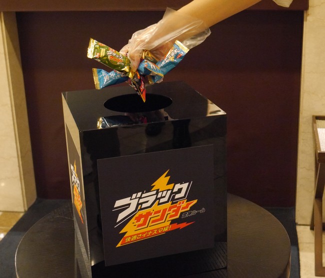 ブラックサンダーミニバーのつかみ取りをチェックイン時に提供します。