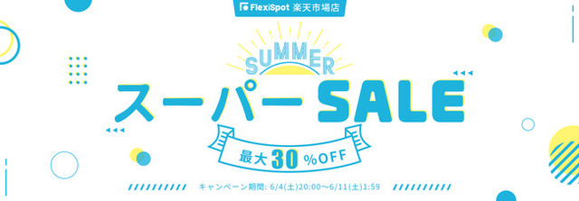 FlexiSpot楽天店舗も今回大セールを開催致します!テンションを上げるため、「楽天スーパーセール」は6月上旬から始まります!!人気商品、新品を参加し、全店全品2倍ポイントと最大30%OFFのプレゼントを用意!またいっぱいクーポンが載せるなど、合計4つの特典が満載しており、楽しく購入することができます。ぜひこのチャンスを見逃さないでください~~