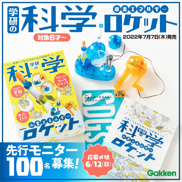 株式会社 学研ホールディングス(東京・品川/代表取締役社長:宮原博昭)のグループ会社、株式会社 学研プラス(東京・品川/代表取締役社長兼COO:南條達也)は、2022年7月7日(木)の『学研の科学 水素エネルギーロケット』発売に先立ち、先行モニターを100名募集いたします。募集締め切りは6月12日(日)となります。