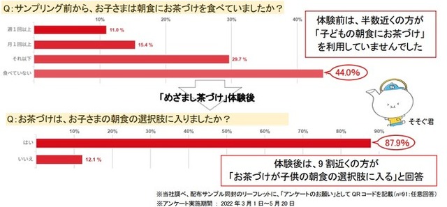 4月から始まる新しい生活は楽しみと期待が大きい反面、生活リズムや生活環境の変化により様々な不安も生じます。特に、朝のバタバタの原因にもなる、子供が「朝起きられない」「朝食をなかなか食べてくれない」ことに対する悩みや不安を持つ親御さんも多いはず。そこで、“朝が苦手なお子さまもササっと食べられるお茶づけ”を朝ごはんの新習慣としてご提案する「めざまし茶づけ」を、今回のサンプリングを通して多くの方に体験していただきました。
