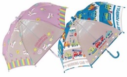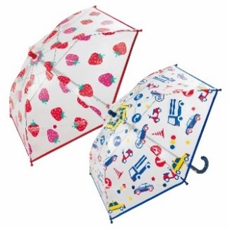 全面透明なので視界が広い傘。お子さまは周りが見やすく、ママ・パパからはお子さまの様子を確認しやすい仕様です。スムーズに開閉できる手開き式で、指を挟みにくいろくろカバー付きです。かわいい柄もポイントです。