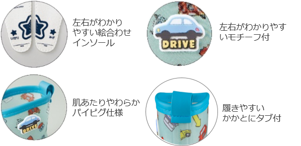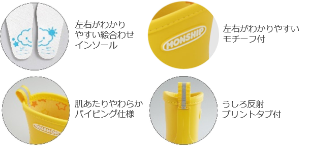雨日でも明るくなるような鮮やかなカラー。絵合わせインソールと外側のロゴモチーフで左右がわかりやすく、お子さまひとりでも履きやすい。裏地は星柄がデザインされています。