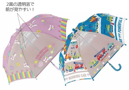 傘に不慣れなお子さまも扱いやすく、つゆ先が目や人に当たるなどのママ・パパの不安を軽減する傘。視界を遮らないよう傘の前後には透明の窓があり、自分でたたみやすいよう留めベルトを太く、面ファスナーは大きくしました。