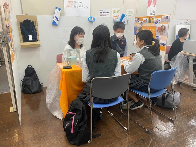 会場では個別にテーブルを設置し、各企業がパンフレットや自社の製品を手に各社の魅力を対話形式で生徒に伝えます。