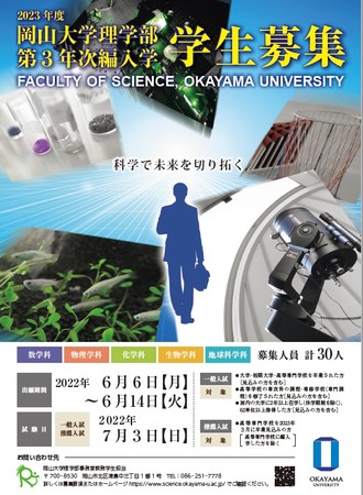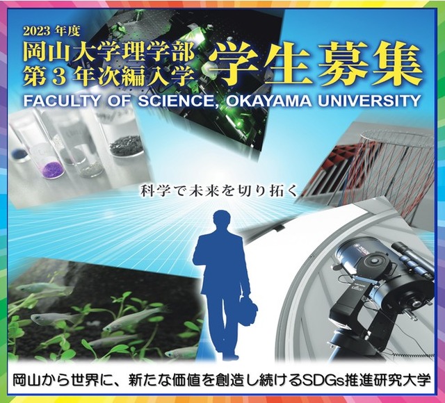 国立大学法人岡山大学(本部:岡山市北区津島中、学長:槇野博史)理学部では、2023年度第3年次編入学の学生募集を行います。