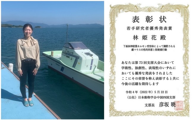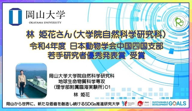 2022年5月21日(土)~22日(日)に島根大学が主幹となってweb開催された生物系三学会中国四国支部大会(第73回動物学会支部大会・島根大会)において、岡山大学大学院自然科学研究科地球生命物質科学専攻(理学部附属臨海実験所)の林 姫花(はやし ひめか)大学院生が「日本動物学会中国四国支部会若手研究者優秀発表賞」を受賞しました。