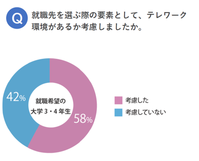 オンライン授業経験者が大半を占める為か、約6割の学生がテレワーク環境を考慮していると回答。