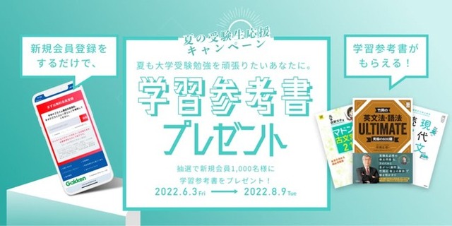 開催期間は2022年6月3日(金)から8月9日(火)まで。期間中は毎週火曜日・10週連続で抽選を行い、100名様ずつ、10週合計で1,000名様に、ご希望の学習参考書を1人1冊ずつプレゼントします。