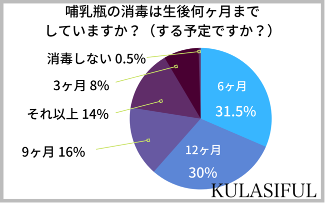 哺乳瓶の消毒を生後何ヶ月まで実施しているかについての調査では、「6ヶ月」31.5%につづき「12ヶ月」30%、「9ヶ月」16%、「3ヶ月」8%で、「それ以上」と答えた方が14%となりました。また、「消毒しない」と答えた方は0.5%と少数派であることが分かりました。