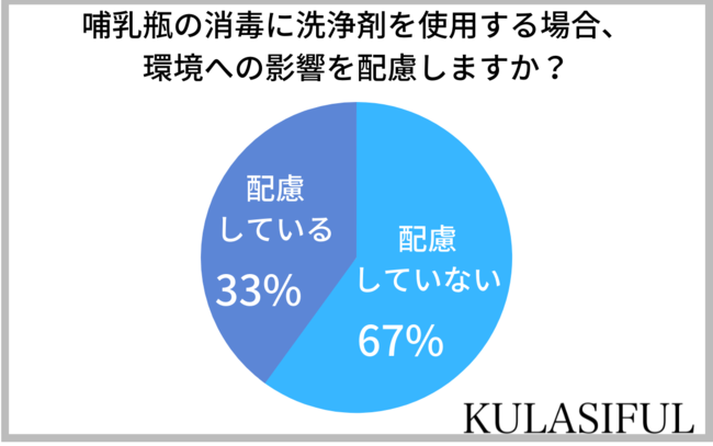 哺乳瓶の消毒に洗浄剤を使用する際に環境へ配慮するかについての意識調査では、「配慮していない」と答えた方が67%、「配慮している」と答えた方が33%となりました。