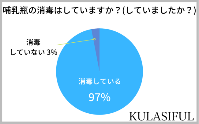 子育て中・子育て経験のある方200名を対象に、哺乳瓶の消毒実施状況について調査を行ったところ、「消毒している」と答えた方が97%、「消毒していない」と答えた方が3%であることがわかりました。