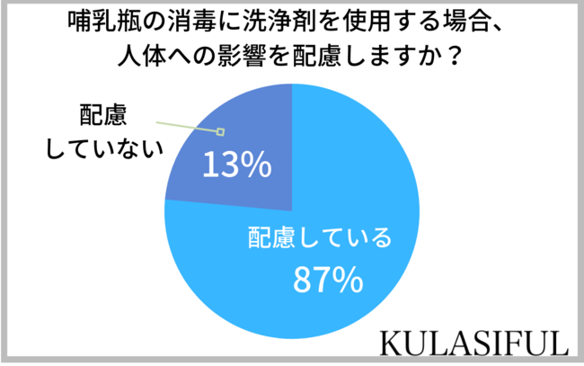 哺乳瓶の消毒に洗浄剤を使用する際に人体へ配慮するかについての意識調査では、「配慮していない」と答えた方が87%、「配慮している」と答えた方が13%となりました。