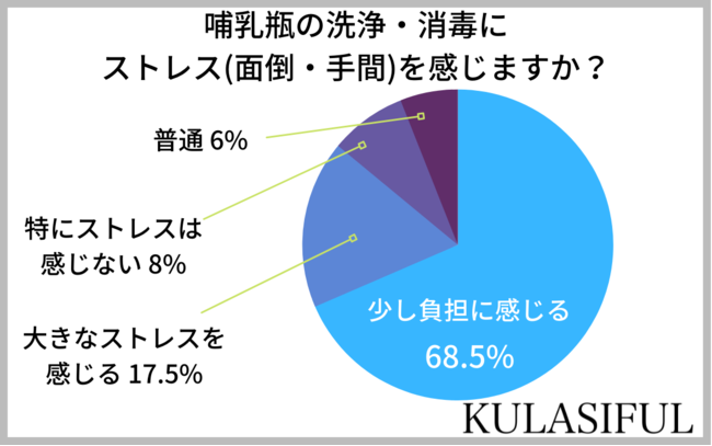 哺乳瓶の洗浄・消毒に対するストレスの調査では、「少し負担に感じる」と答えた方が68.5%で、それに続き「大きなストレスを感じる」17.5%、「特にストレスは感じない」8%、「普通」6%という結果になりました。