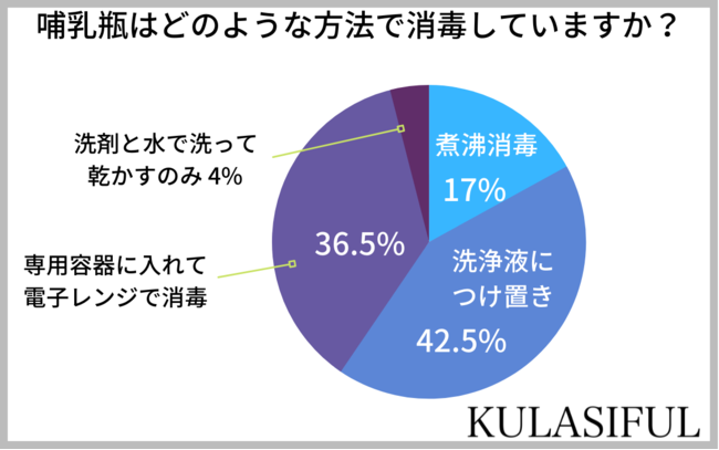 哺乳瓶の消毒方法に関しての調査では、「洗浄液につけ置き」をしている方が42.5%と多数。それに続き「専用容器に入れて電子レンジで消毒」36.5%、「煮沸消毒」17%、「洗剤と水で洗って乾かすのみ」4%という結果になりました。