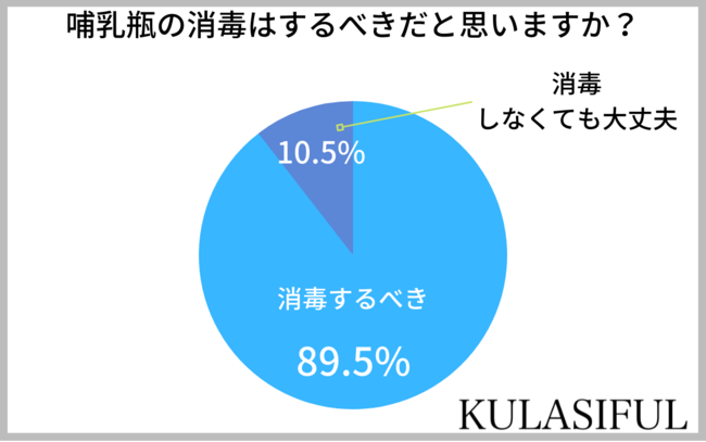 哺乳瓶の消毒に関する意識調査では、「消毒するべき」と考える方が89.5%に対して「消毒しなくても大丈夫」だと答えた方は10.5%となりました。